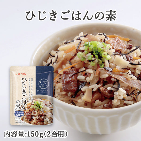 製品総量中に国内産ひじきを13.3%使用したひじきごはんの素。海の幸ひじきをはじめ、鶏肉やたけのこ、油揚げなど具材がたっぷり入った炊き込みごはんの素です。自然の恵みを存分にお召し上がりいただける商品となっています。飽きのこない味付けはお弁当にも最適です。